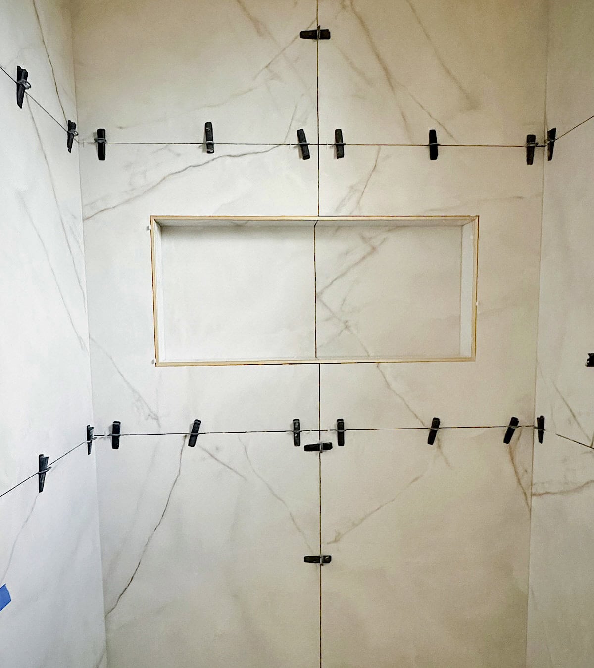 Tile layout completely changes the vibe of a bathroom. Straight stack? Offset? Herringbone? Vertical? We had to decide this before installation started because once they begin laying tile, changing your mind is not simple. We also ensured the layout aligned with focal points such as the niche and vanity. Even a few inches off can throw off the entire look. This step really takes patience, but it’s worth thinking through carefully so everything feels intentional. Honestly, my biggest source for our floor layout pattern was Pinterest. That’s where I finally found a design that both Matt and I loved, and I still enjoy it every single day when I walk into the bathroom. So really, go with what works best for your space and what you’ll love long term, not just what’s trending right now.