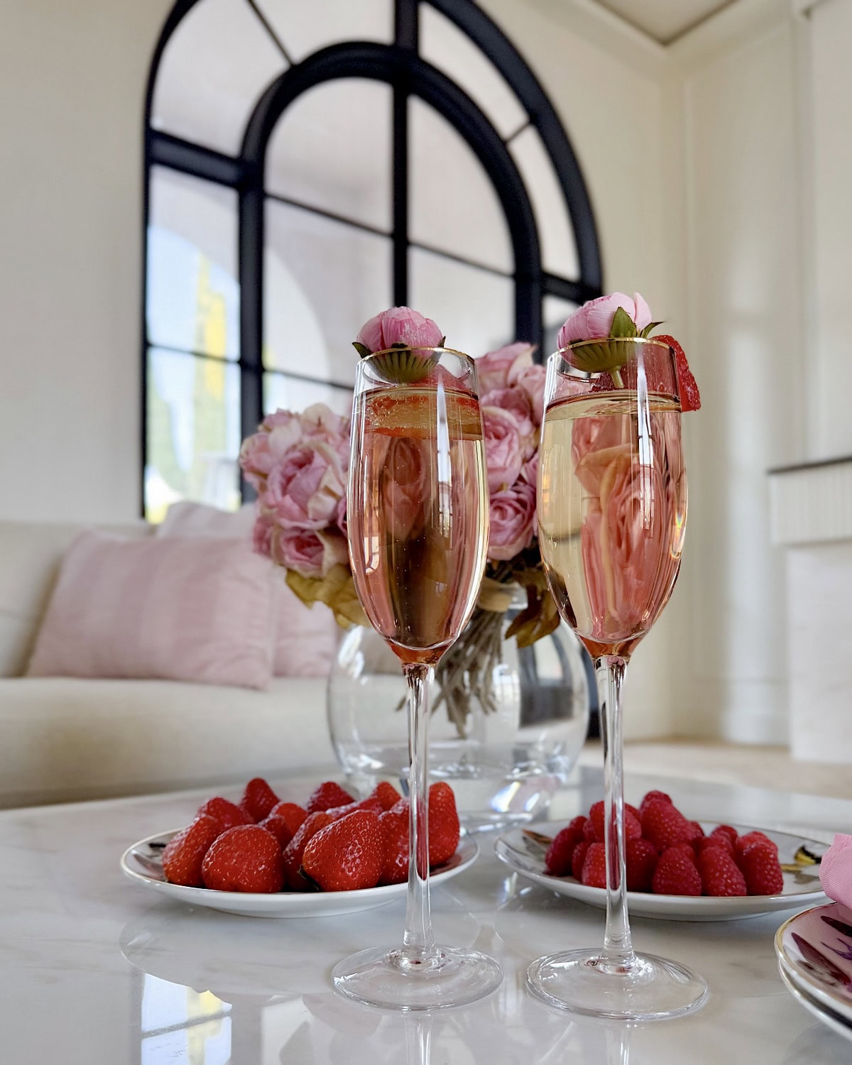 One of my favorite things to do is make the drinks part of the dessert table. Champagne flutes with fresh strawberries, sparkling rosé in crystal glasses, or even mocktails with edible flowers can double as both a drink and a “dessert.” To bring it all together, I’ll set them on a brass or gold round serving tray so they feel like part of the display instead of separate.