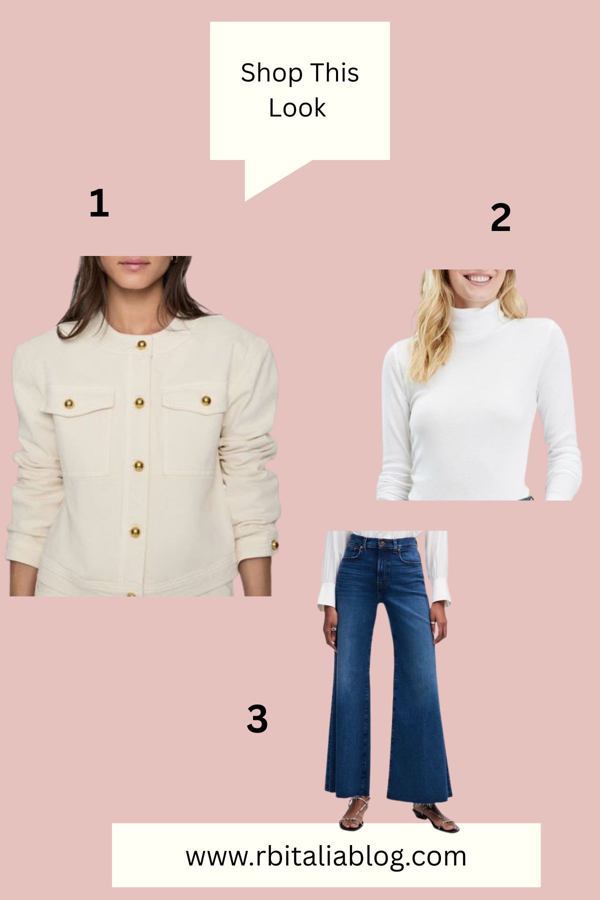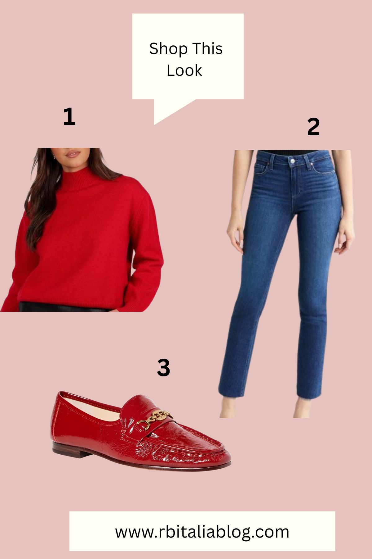 You can’t go wrong with this one—it’s the kind of outfit I could live in all season. The mock-neck sweater is warm but lightweight enough to layer, and classic straight jeans are always a good base. Throw on loafers and you’re out the door. It’s super wearable, totally timeless, and fits right into any capsule wardrobe without overthinking it.