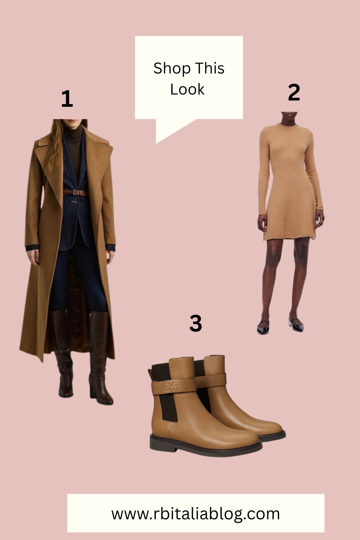 Camel Wool Coat + Mini or Midi Dress + Leather Ankle Boots