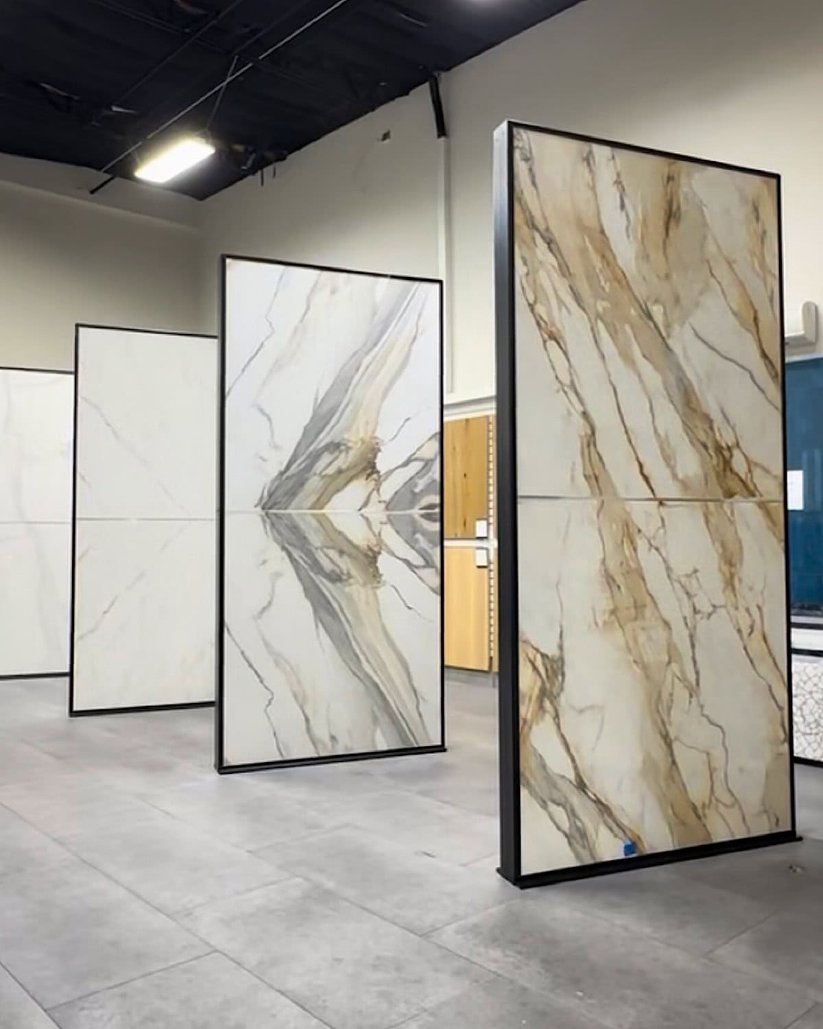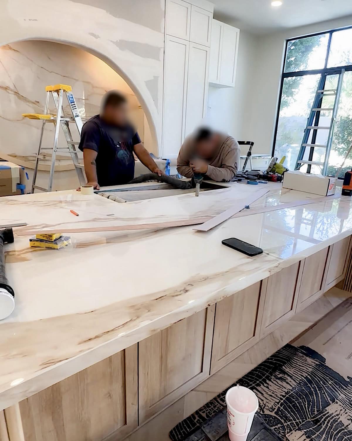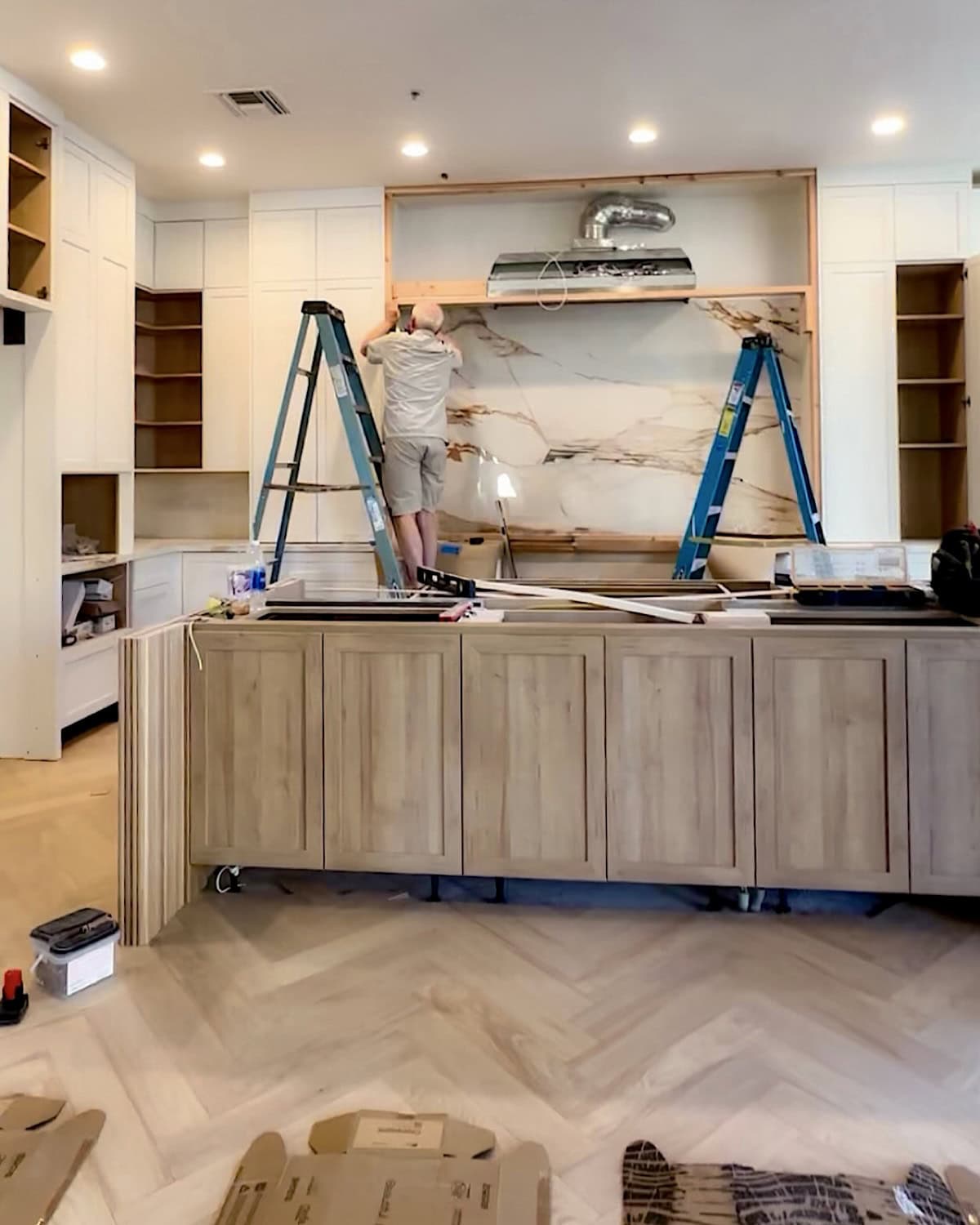 In our old kitchen, we had a more traditional backsplash tile. For this renovation, we really wanted to change things up. We planned to switch from the previous backsplash tile look to large stone slabs running from the countertop to the ceiling for a more dramatic, seamless feel. It definitely makes a statement, but it also means we had to be much more thoughtful about the material we chose.