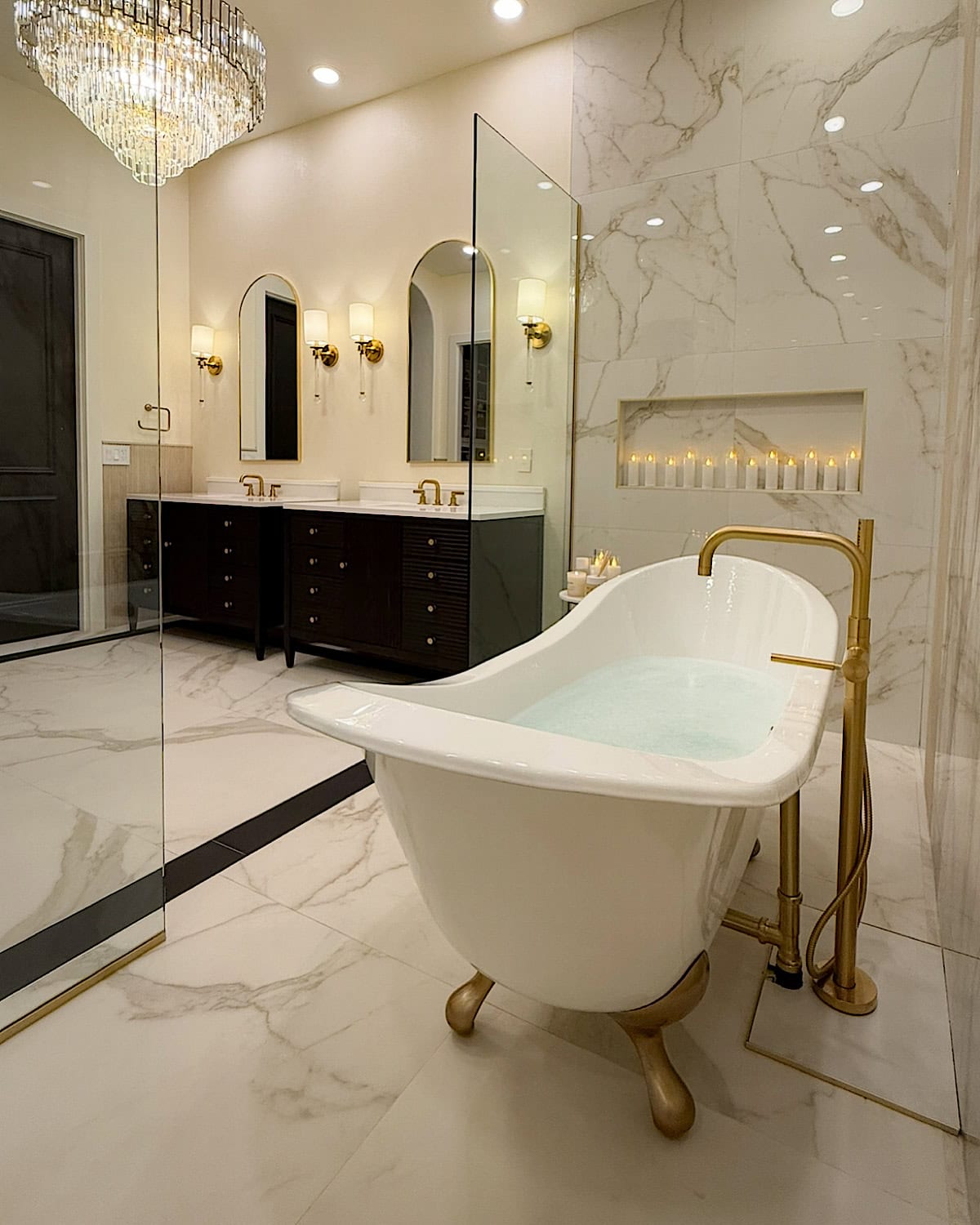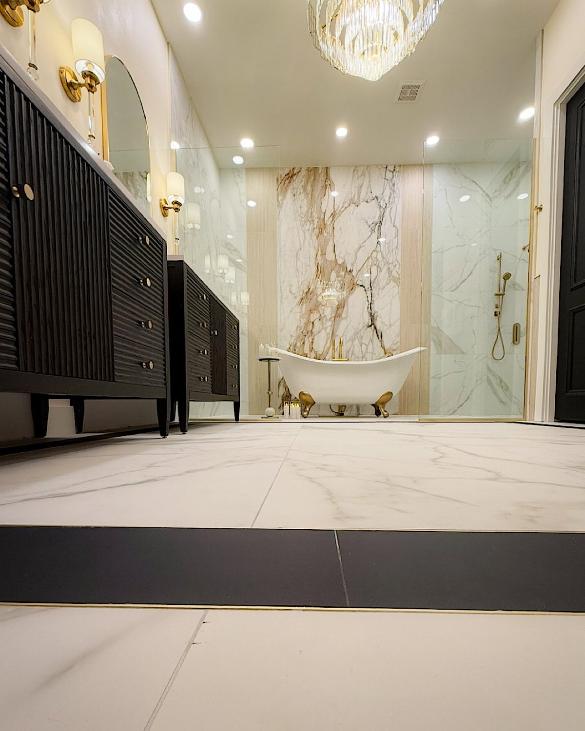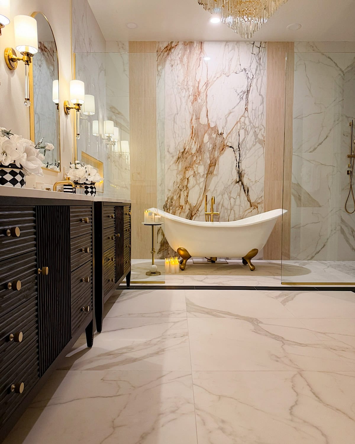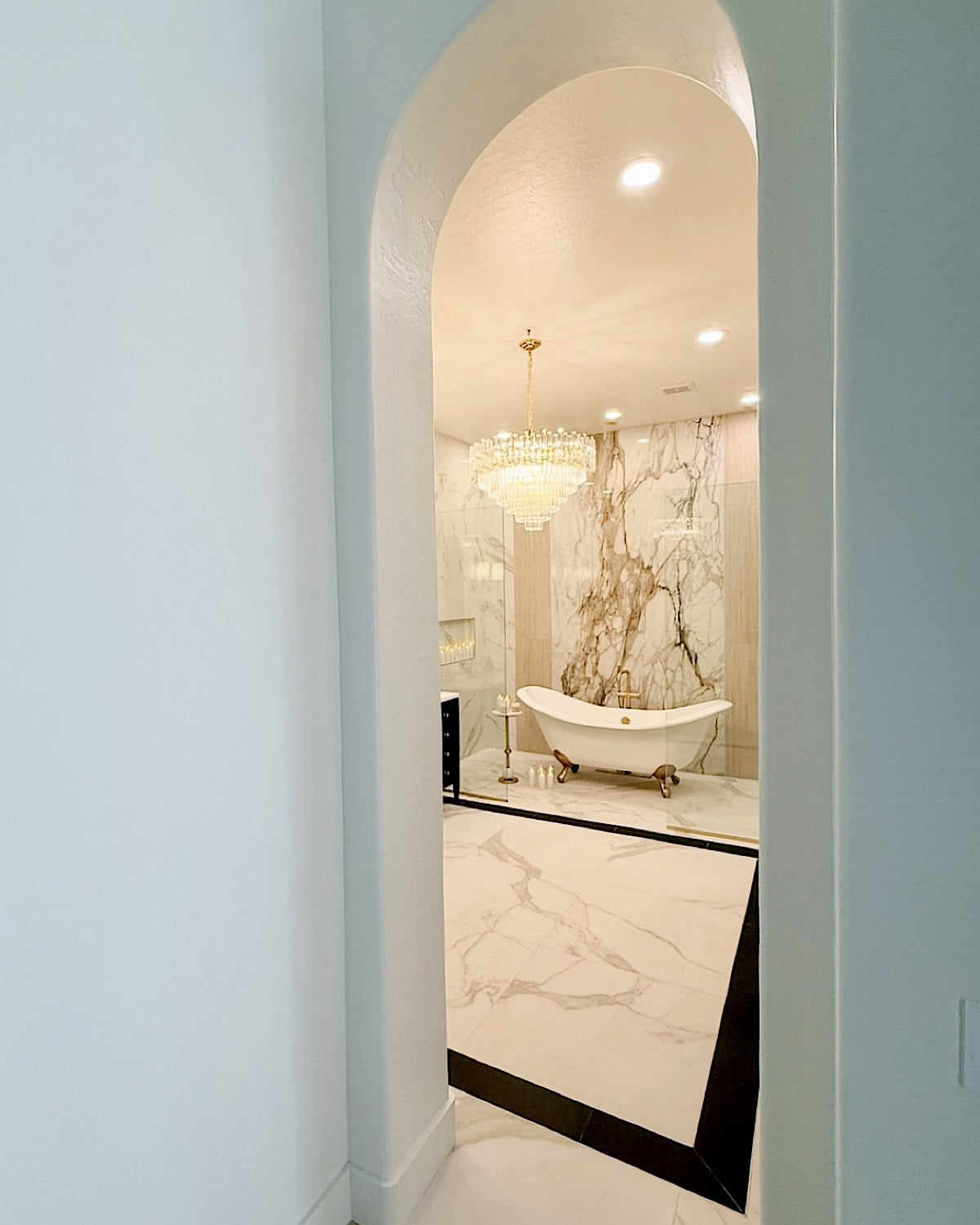We also made a conscious choice to have only two things stand out in the entire room: the slab behind the bathtub and the chandelier. Those were our main design moments, and everything else needed to stay quiet so nothing would visually compete. It’s such a simple approach, but it really helps the room feel more organized and easier on the eyes.