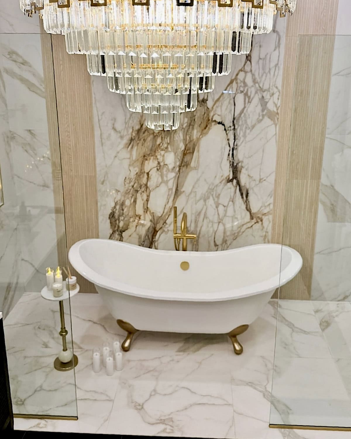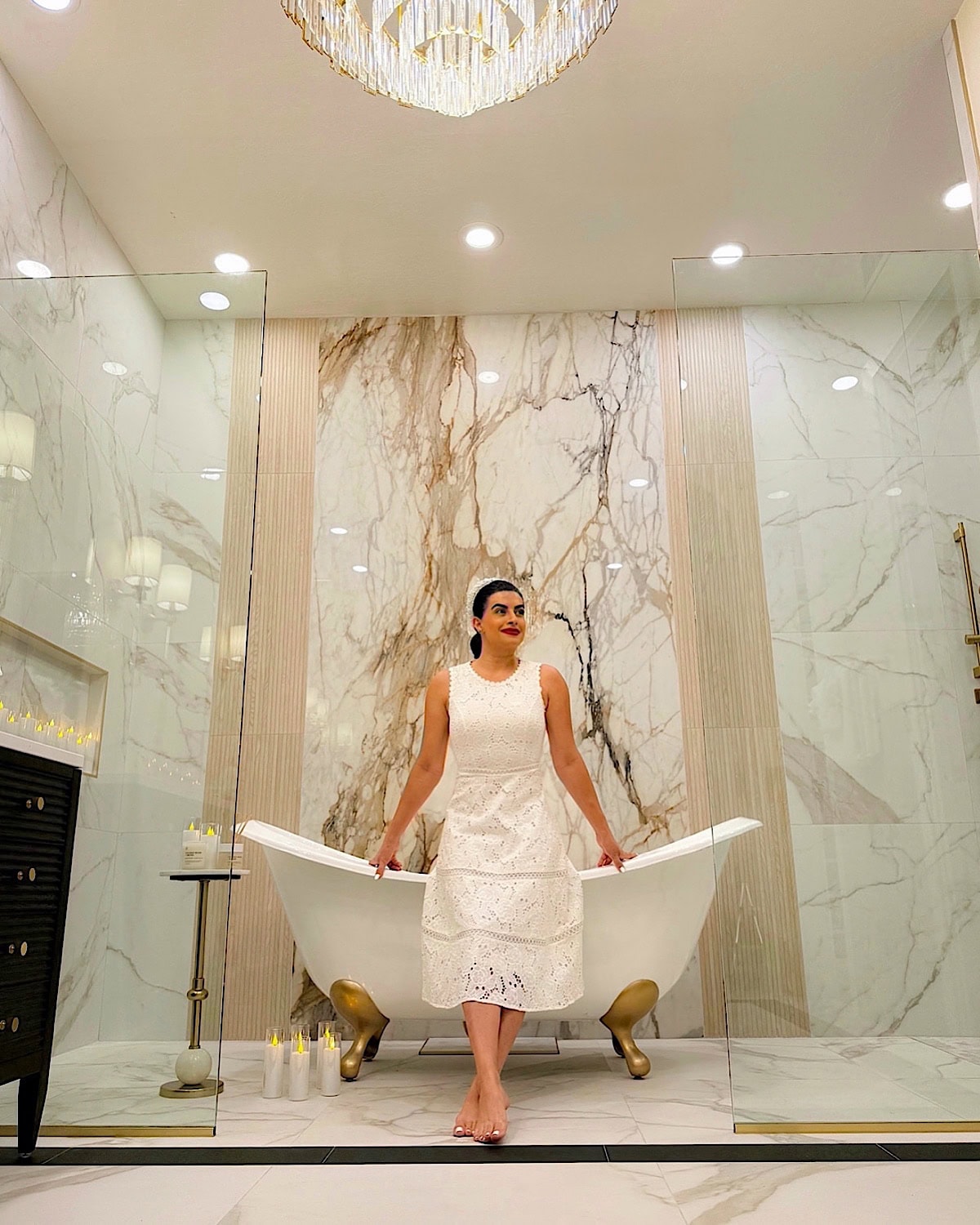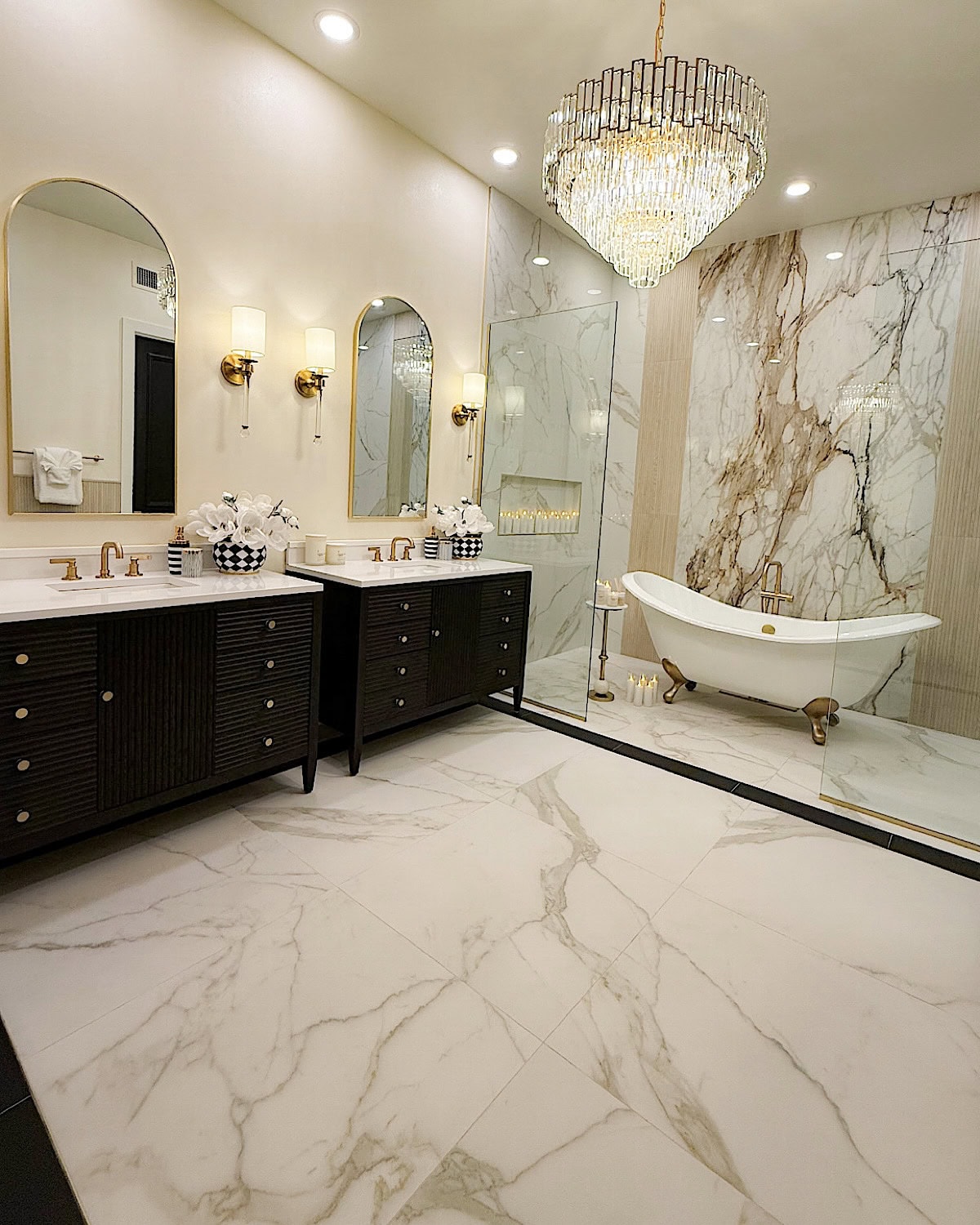 We also made a conscious choice to have only two things stand out in the entire room: the slab behind the bathtub and the chandelier. Those were our main design moments, and everything else needed to stay quiet so nothing would visually compete. It’s such a simple approach, but it really helps the room feel more organized and easier on the eyes.