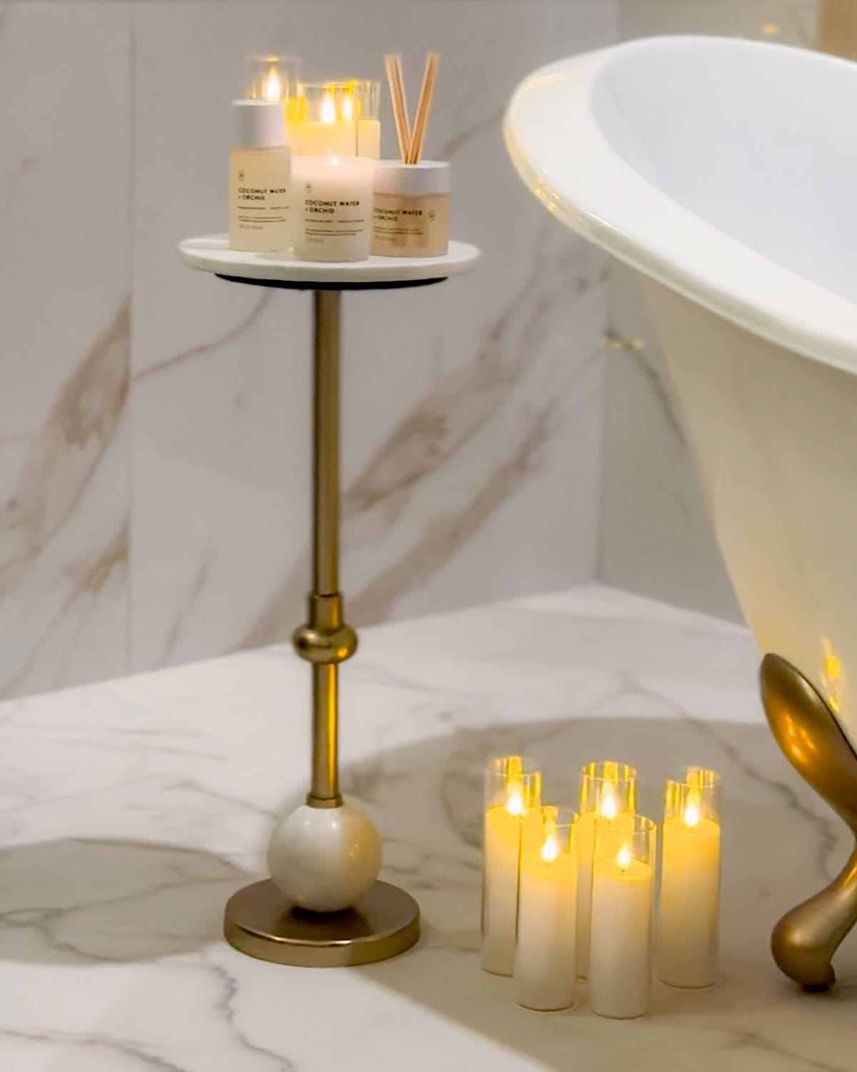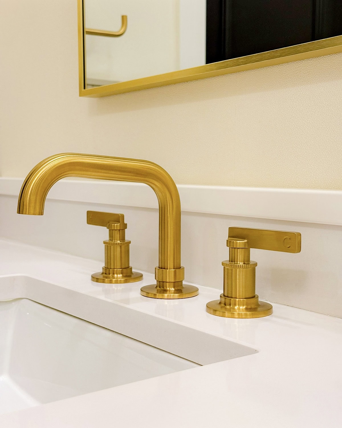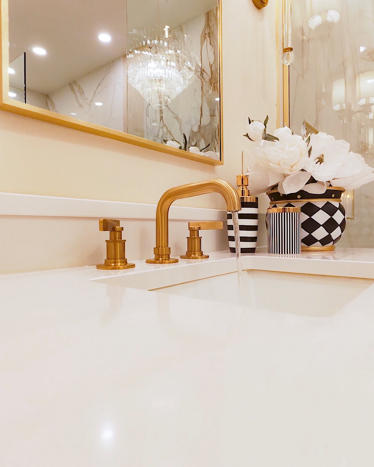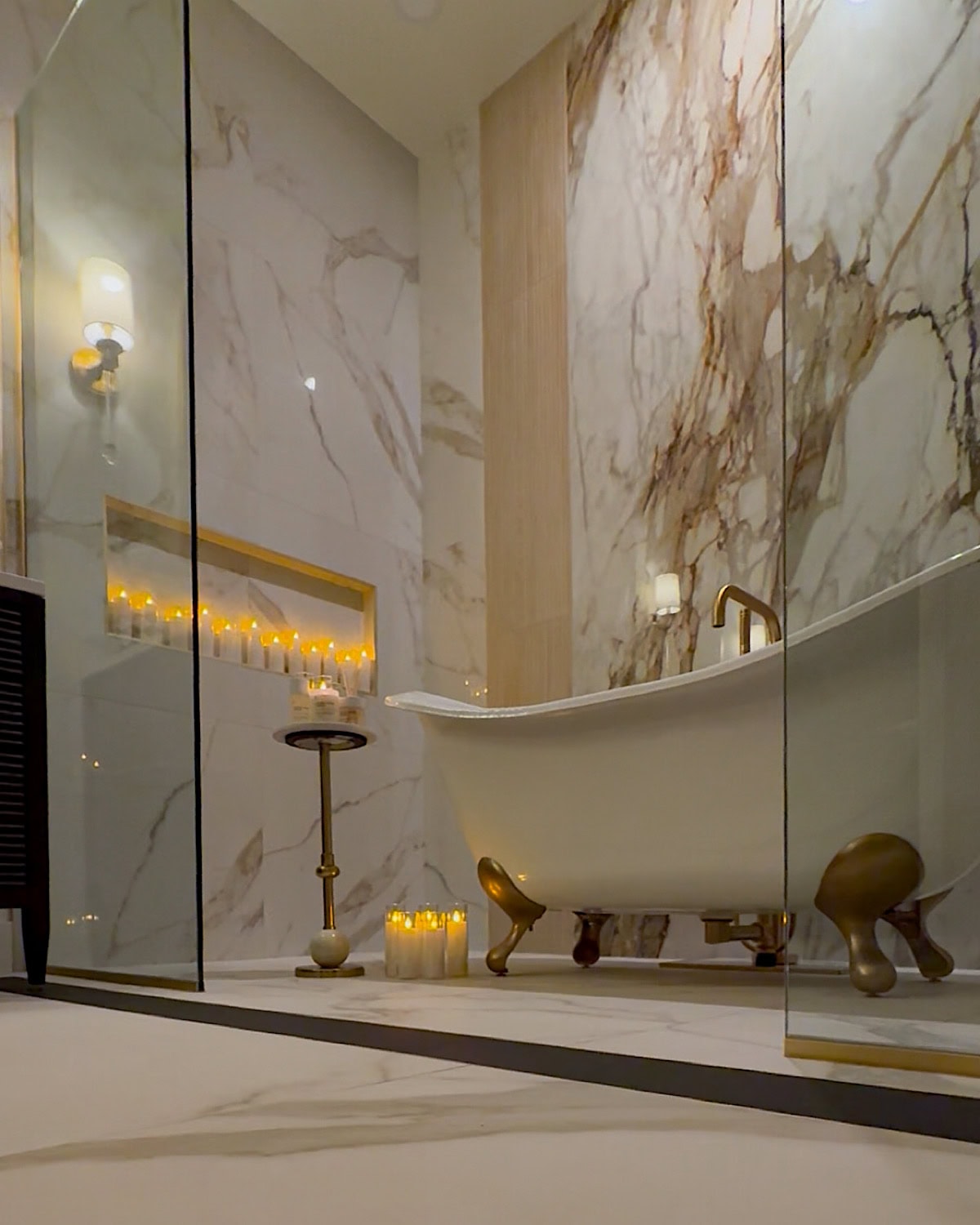We also made a conscious choice to have only two things stand out in the entire room: the slab behind the bathtub and the chandelier. Those were our main design moments, and everything else needed to stay quiet so nothing would visually compete. It’s such a simple approach, but it really helps the room feel more organized and easier on the eyes.