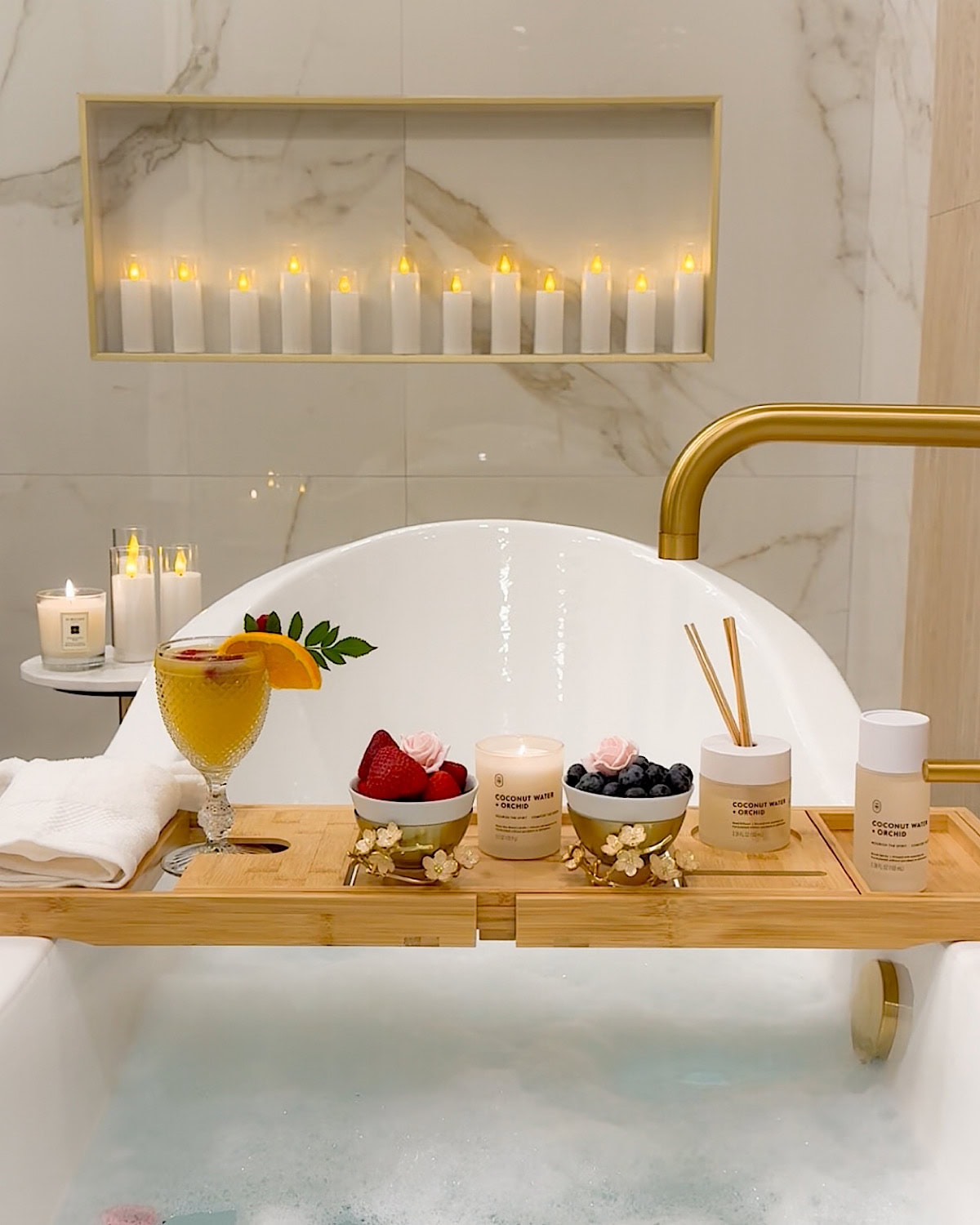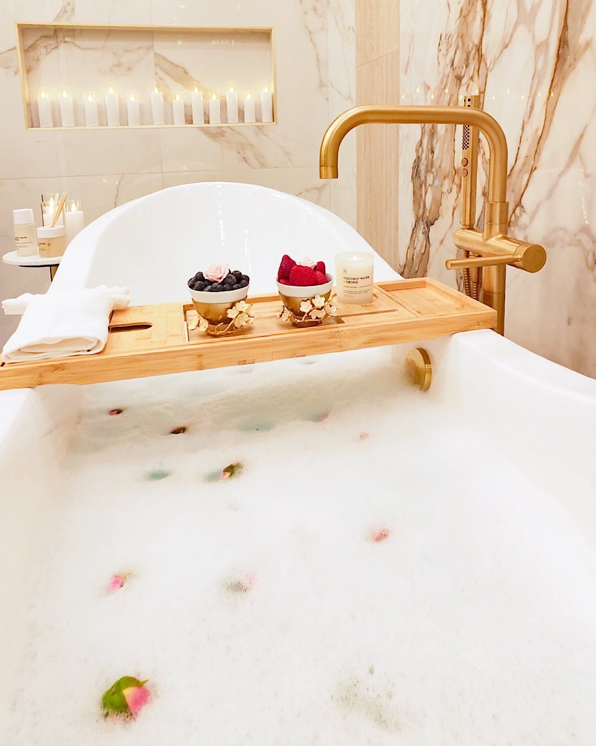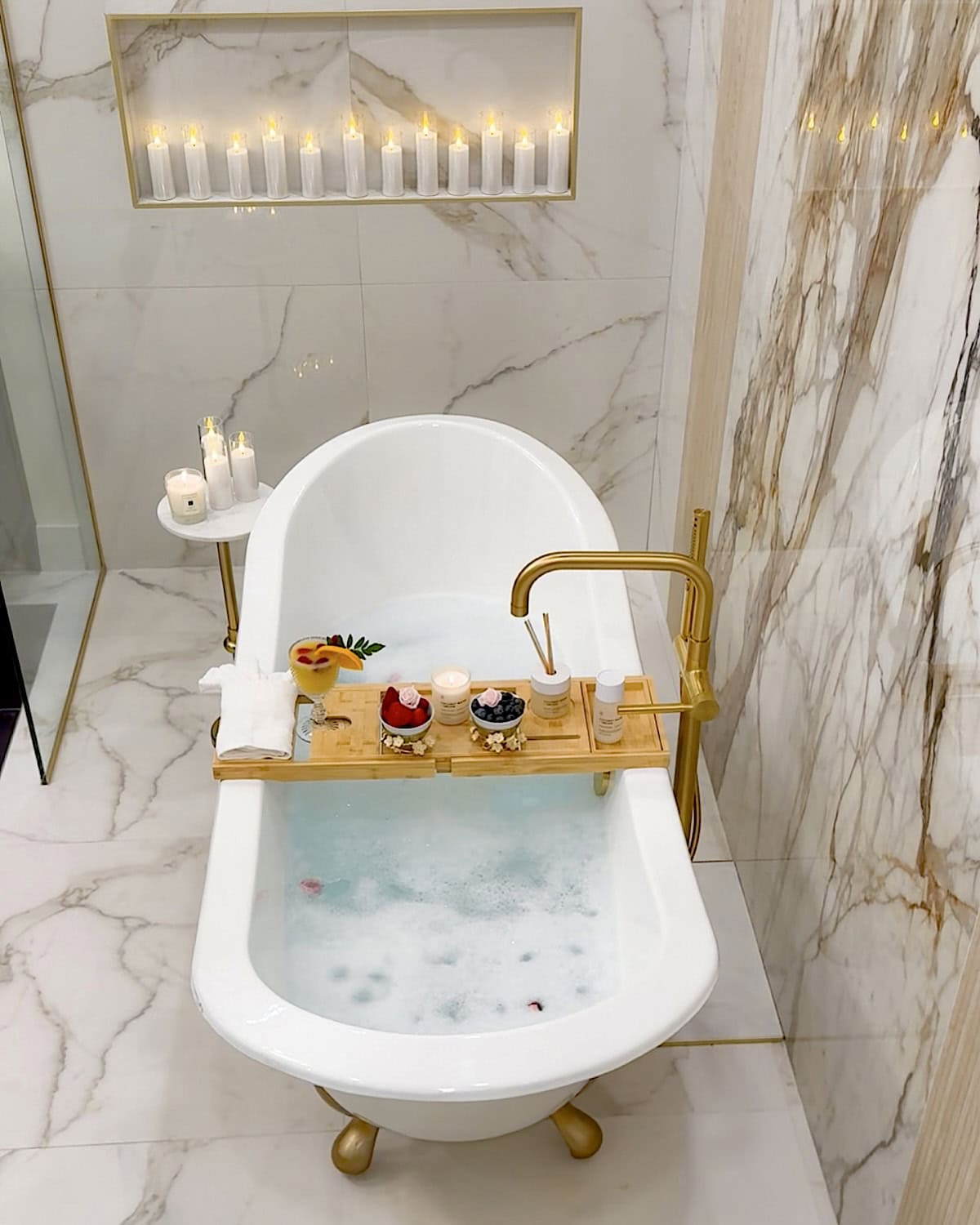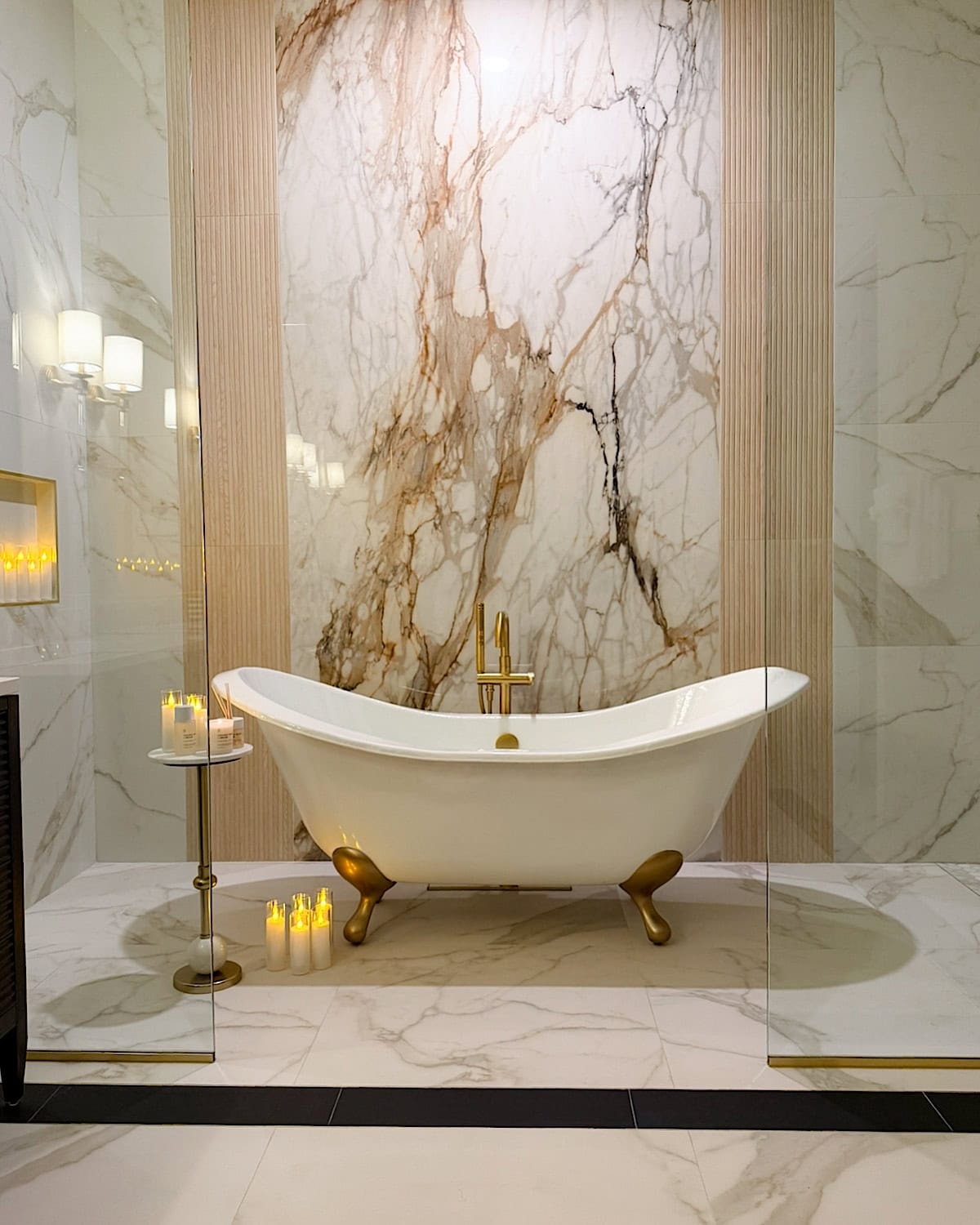 A beautiful stone slab or a pretty tile pattern just holds up so much better and still gives you that spa-like vibe. Whatever style you choose, just make sure that the wall has its “moment”. A well-designed backdrop behind the bathtub instantly pulls the whole bathroom together and makes the space feel more high-end and relaxing without trying too hard.